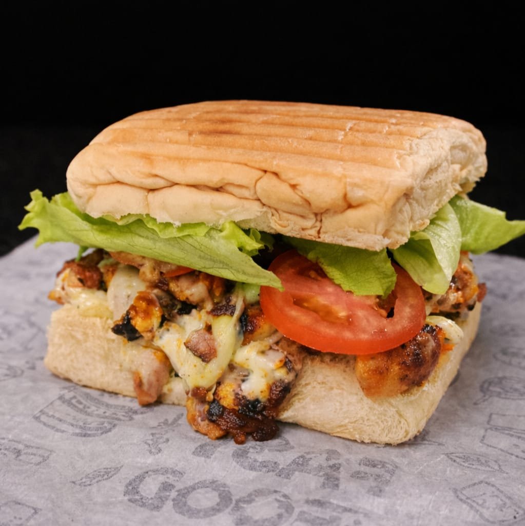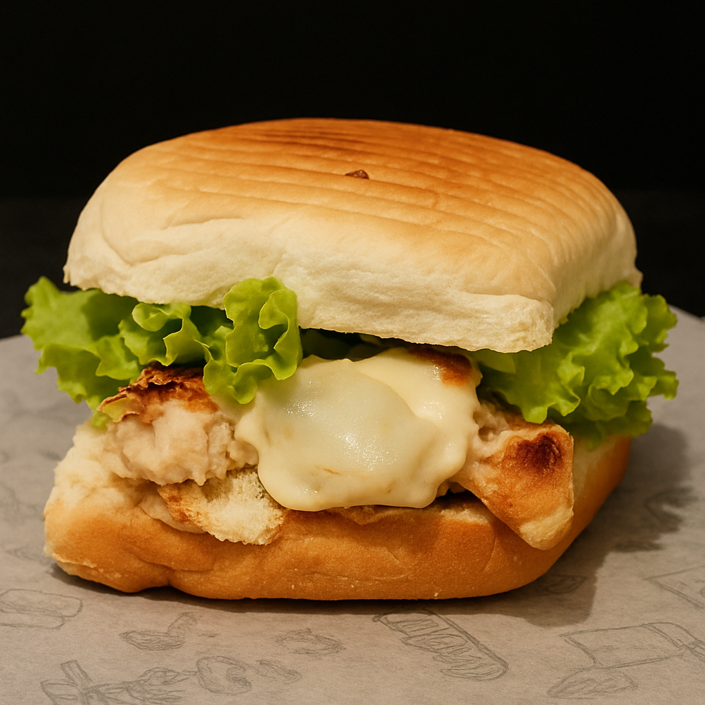 Pão de Hambúrguer, maionese da casa, 250g de filé de frango grelhado, catupiry, queijo mussarela, alface americana e tomate.