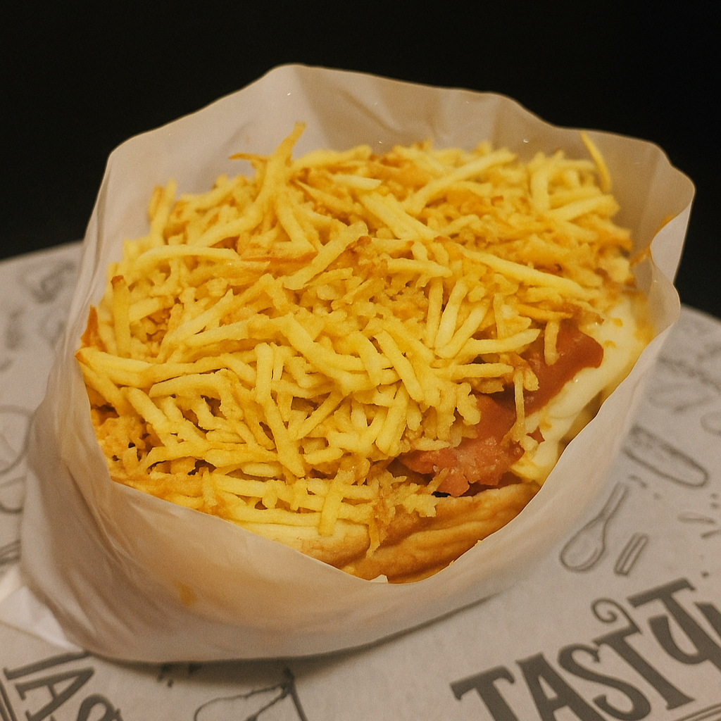 Pão, 1 salsicha, purê de batata caseiro, milho, tomate, ketchup, mostarda, queijo mussarela, e batata palha.