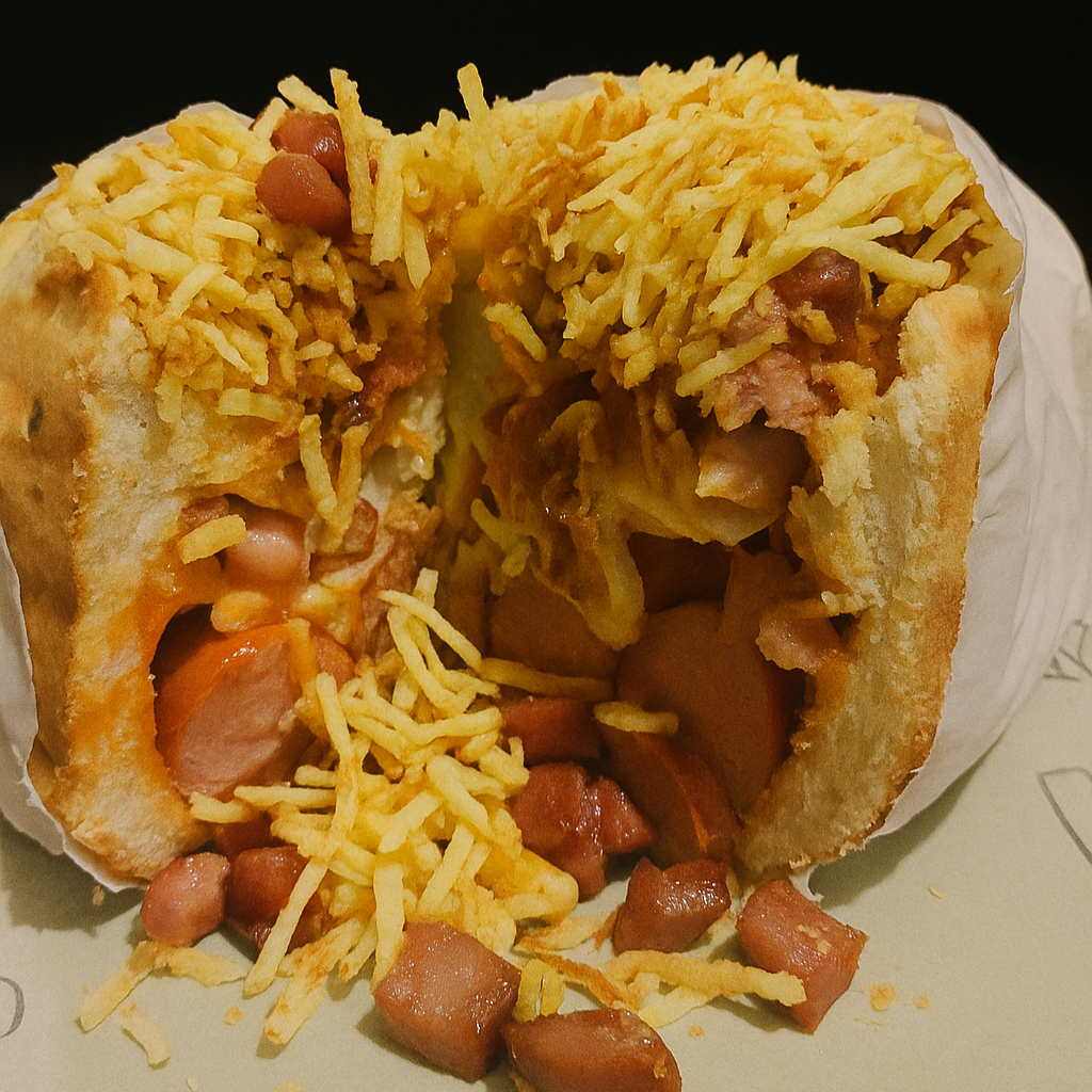 Pão, 2 salsichas, purê de batata caseiro, milho, tomate, ketchup, mostarda, queijo mussarela, bacon, calabresa e batata palha.
