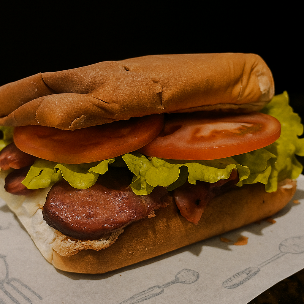 Pão de Hambúrguer, maionese da casa, hambúrguer artesanal de 150g, calabresa, presunto, queijo mussarela, alface americana e tomate.