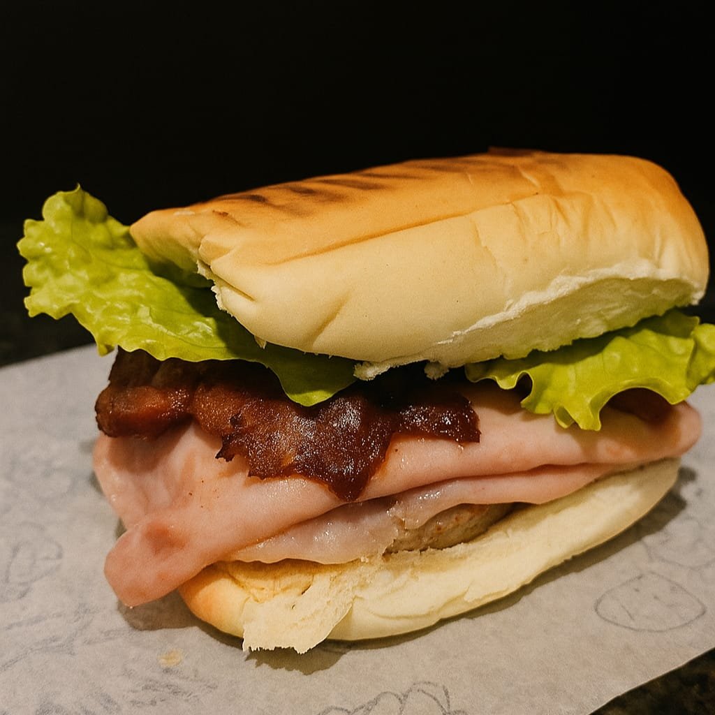 Pão de Hambúrguer, maionese da casa, hambúrguer artesanal de 150g, bacon, presunto, queijo mussarela, alface americana e tomate.