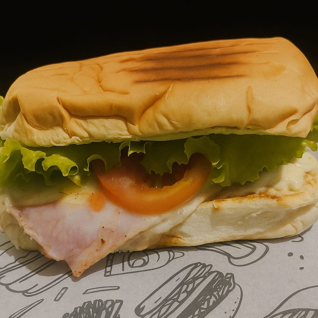 Pão de Hambúrguer, maionese da casa, hambúrguer artesanal de 150g, presunto, queijo mussarela, alface americana e tomate.